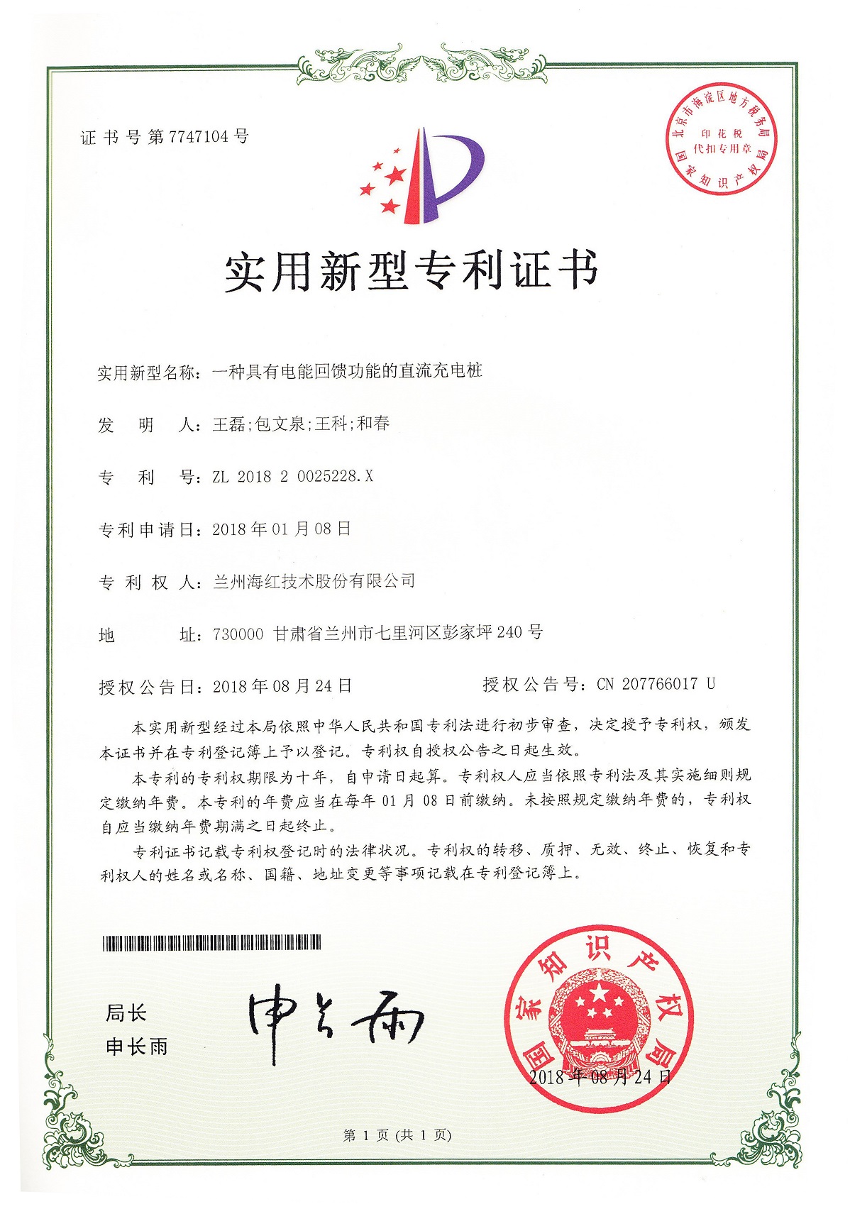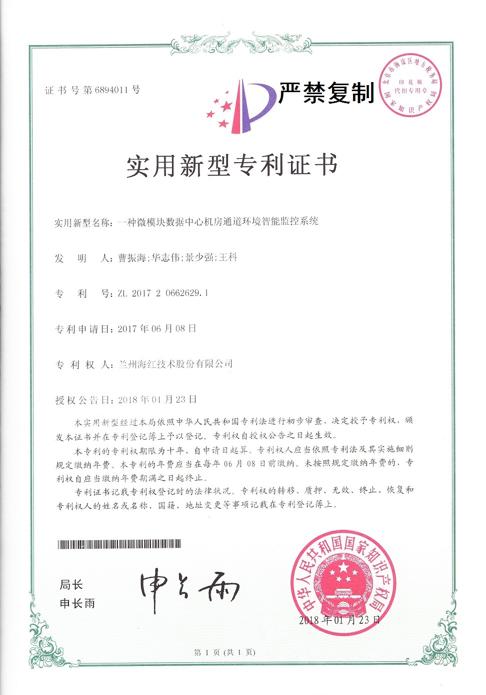我公司又取得一項實用新型專利和完成兩項計算機軟件著作權(quán),至此我公司申請受理的專利數(shù)累積83項(其中發(fā)明專利17項,實用新型專利55項,外觀設(shè)計專利3項,軟件著作權(quán)8項),已獲得授權(quán)...
